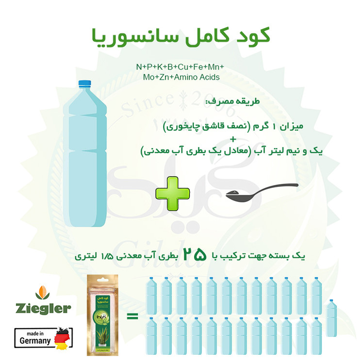 داشتن گیاهان سانسوریا شاداب و باطراوت نیازمند مراقبتهایی ویژه است. پس از رعایت شرایط محیطی و نگهداری گیاه انتخاب نوع کود برای نگهداری و پرورش سانسوریا امری بسیار مهم و ضروری محسوب میشود، محصولی که در تصویر مشاهده مینمایید «کود کامل سانسوریا گیلدا» می باشد که توسط شرکت «گیلدا» عرضه میگردد. این محصول یکی از محصولات تولیدی شرکت «زیگلر آلمان» است. این کود حاوی نسبت متعادلی از عناصر پرمصرف مورد نیاز گیاه سانسوریا نظیر نیتروژن، فسفر و پتاسیم میباشد که در تمام مراحل رشد آن قابل مصرف می باشد. علاوه بر این سایر عناصر كم مصرف نظیر بور، مس، آهن، منگنز، مولیبدن و روی به صورت کلات (EDTA) در این کود گنجانده شده است که با وجود 2 درصد منیزیم یک کود کامل به شمار میرود. همچنین این محصول به جهت کاهش اثر تنش های محیطی، مقاوم سازی و رشد مطلوب حاوی اسیدهای آمینه ضروری میباشد که موجب تحریک رشد گیاه شده و سبزینگی و جذب سایر عناصر توسط گیاه را افزایش داده و از کمبود های تغذیه ای یا عدم توازن عناصر غذایی نیز جلوگیری مینماید. گیلدا از سال 1385 در زمینه تولید نهاده های کشاورزی تحقیق و فعالیت مینماید. تحقیقات تخصصی انجامشده توسط متخصصان این برند، باعث تولید محصولاتی طبیعی و ارگانیک با نام تجاری گیلدا شده است. محصولات این شرکت علاوه بر استفاده در بخش کشاورزی، برای پرورش و رشد گیاهان خانگی بسیار مفید و مناسب هستند. استفاده از این محصولات سلامتی و شادابی بیشتری به گیاهان شما خواهد بخشید.