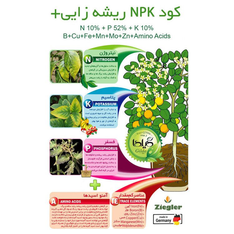 داشتن گیاهان شاداب و باطراوت نیازمند مراقبتهایی ویژه است. پس از رعایت شرایط محیطی و نگهداری گیاه انتخاب نوع کود برای نگهداری و پرورش گیاهان امری بسیار مهم و ضروری محسوب میشود، محصولی که در تصویر مشاهده مینمایید «کود کامل NPK ریشه زایی گیلدا» می باشد (NPK 10 52 10 + TE+A)که توسط شرکت «گیلدا» عرضه میگردد. این محصول یکی از محصولات تولیدی شرکت «زیگلر آلمان» است. این کود حاوی نسبت فسفر بالا جهت توسعه ریشه (10-52-10) از عناصر پرمصرف مورد نیاز گیاهان نیتروژن، فسفر و پتاسیم میباشد، کود فسفر بالا به گیاهان کمک می کند تا ریشه های خود را در بستر گسترش داده و ریشه های جدید تولید نمایند که در رشد و سلامت گیاه نقش زیادی را دارا می باشند. این کود حلالیت بالایی داشته و به سرعت جذب گیاه می شود و در تمام مراحل رشد آن قابل مصرف می باشد. علاوه بر این سایر عناصر كم مصرف (TE) نظیر بور، مس، آهن، منگنز، مولیبدن و روی به صورت کلات (EDTA) در این کود گنجانده شده است که با وجود این عناصر یک کود کامل به شمار میرود. همچنین این محصول به جهت کاهش اثر تنش های محیطی، مقاوم سازی و رشد مطلوب حاوی اسیدهای آمینه ضروری (A) میباشد که موجب تحریک رشد گیاه شده و سبزینگی و جذب سایر عناصر توسط گیاه را افزایش داده و از کمبود های تغذیه ای یا عدم توازن عناصر غذایی نیز جلوگیری مینماید. علائم کمبود فسفر: در اثر کمبود فسفر در خاک رشد گیاه محدود شده و گیاه بسیار لاغر می شود برگها به رنگ سبز تیره مایل به آبی یا ارغوانی در می آیند و گاهی لکه ها و یا نوارهایی به همین رنگ بر روی پهنای برگ ظاهر می شود. علائم کمبود ابتدا در برگهای جوان سرشاخه ها به رنگ سبز طبیعی باقی می مانند. انتقال فسفر از برگ های پیر به برگهای جوان منجر به ریزش برگ های پیر میشود. گیلدا از سال 1385 در زمینه تولید نهاده های کشاورزی تحقیق و فعالیت مینماید. تحقیقات تخصصی انجامشده توسط متخصصان این برند، باعث تولید محصولاتی طبیعی و ارگانیک با نام تجاری گیلدا شده است. محصولات این شرکت علاوه بر استفاده در بخش کشاورزی، برای پرورش و رشد گیاهان خانگی بسیار مفید و مناسب هستند. استفاده از این محصولات سلامتی و شادابی بیشتری به گیاهان شما خواهد بخشید.